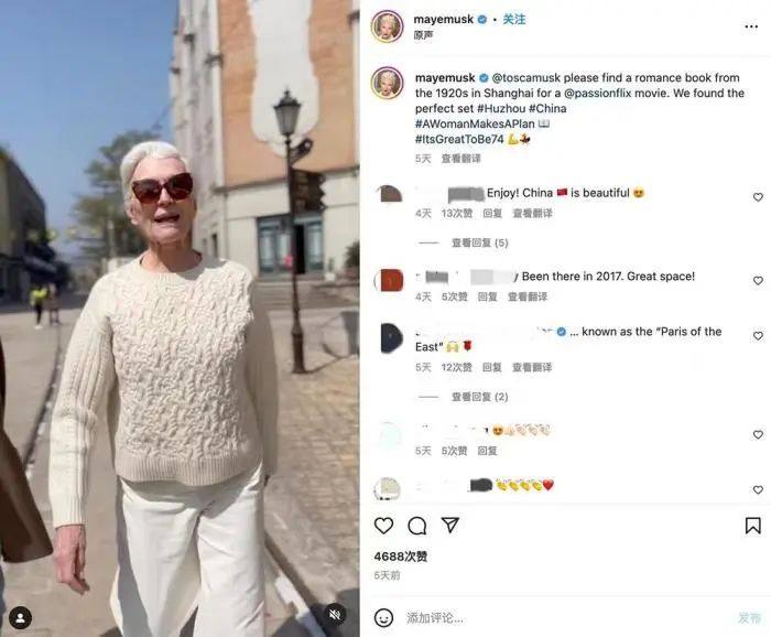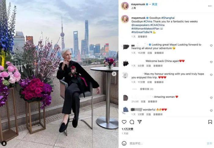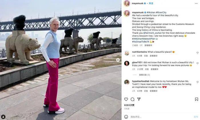 在这条帖子下,有外国网友留言道:“我在2017年去过这里,非常好的地方!”还有网友评论称:“好好享受!中国非常美。”在结束了湖州的行程后,梅耶又来到了武汉。在武汉之旅中,她参观了江汉关博物馆和宋庆龄故居,这里的江水桥梁和精美雕刻令她印象深刻。3月31日,她在社交平台上分享了一组游览观光照,并配文称,“中国悠久的历史文化令人着迷。”梅耶·马斯克在武汉游览。图片来源:梅耶社交媒体截图武汉之后,梅耶抵达了此次中国之行的最后一站——上海。4月2日,梅耶晒出了自己和上海地标建筑东方明珠的合照,并发文称:“再见上海,再见中国,感谢你让我度过了愉快的两周。”梅耶·马斯克在上海游览。图片来源:梅耶社交媒体截图公开资料显示,梅耶·马斯克1948年出生于加拿大,拥有加拿大、南非、美国三国公民的身份。她在社交媒体上的自我介绍是“一名演讲家、营养师、模特和国际畅销书作家”。据外媒此前报道,埃隆·马斯克也正在计划访问中国,最快可能在4月进行。(来源:中国新闻网)
