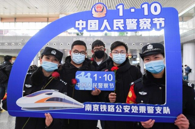 在南京南站候车大厅,民警和旅客合影,共迎“中国人民警察节”(2021年1月7日摄)。新华社记者 季春鹏 摄