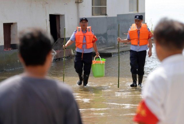 江西省彭泽县棉船镇棉船派出所的梅玉胜(左二)和同事帮助一名家中进水的居民拿取生活必需品(2020年7月22日摄)