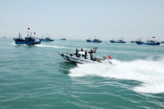 海警执法员加强海域巡逻,防止黑恶势力滋扰作业渔船(2020年8月16日摄)。