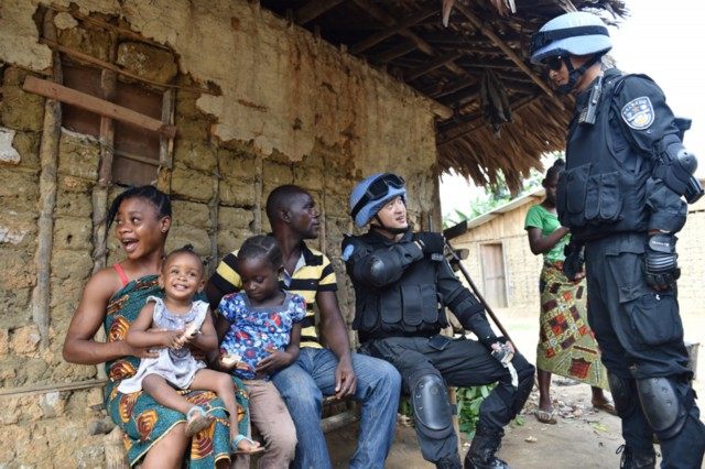 中国维和警察防暴队队员在利比里亚格林维尔的一座村庄询问当地治安等情况(2015年11月3日摄)。新华社记者 孙瑞博 摄