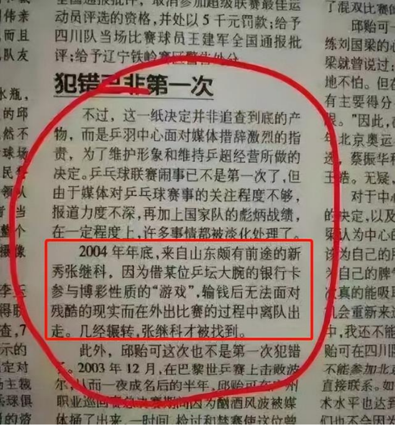 其实,无风不起浪,坊间关于张继科赌博的传闻一直存在。2004年10月,因违反队规张继科被国家队退回省队。当年的《体坛周报》在小标题“犯错已非第一次”部分,谈到了张继科,说他借了某位乒坛大腕的银行卡参加博彩“游戏”,输钱后没脸见大哥,而离队出走。