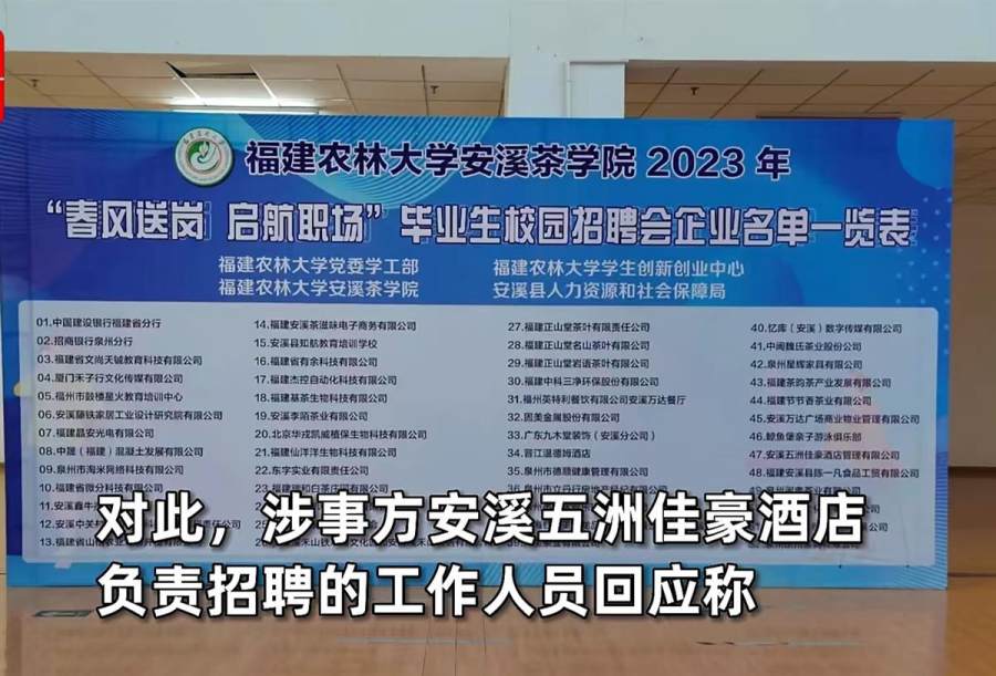近日,网传“福建农林大学安溪茶学院春招现场,有企业在招聘‘KTV公主’”。对此,多数网友表示愤怒,“四年学习,一朝就业KTV?”还有网友质疑学校在邀请用人单位时,未对招聘岗位进行审查。涉事学校回应称,网传的“KTV公主”岗位并未出现在用人单位送审的岗位列表中,但却出现在了招聘会当天的企业易拉宝上,校方发现后立刻进行了处理,最后涉事企业选择撤除这一岗位,当天也并未在校内招聘KTV公主。