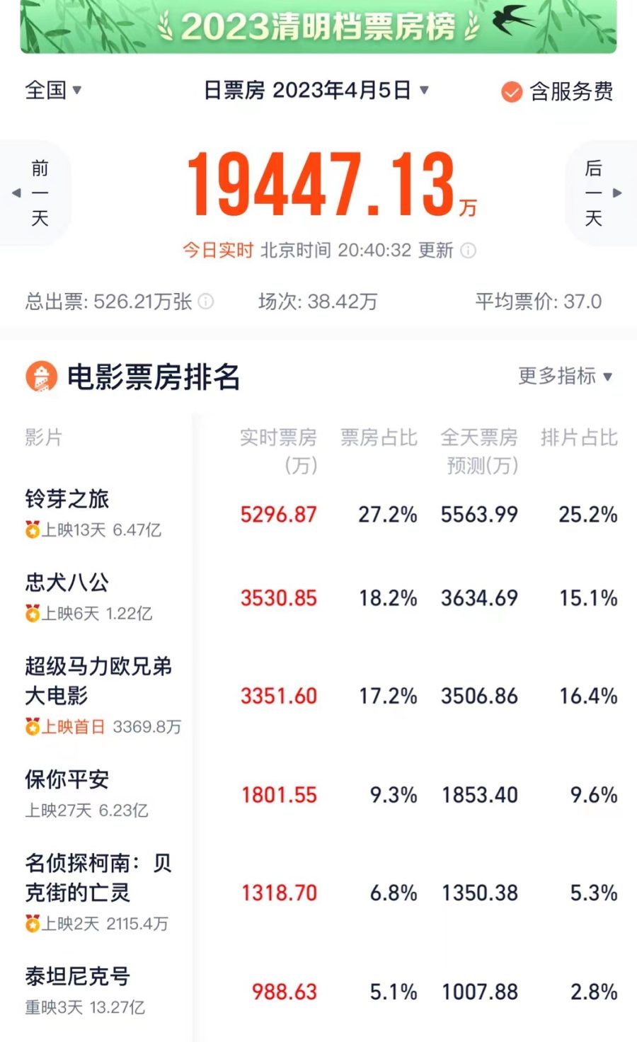 而在本次清明档入榜前三名的电影只有一部《超级马力欧兄弟大电影》是清明节当日上映的,其他两部都已上映一到两周的时间。