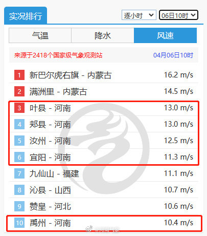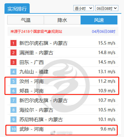 今早8时,汝州、郏县和武陟登上全国实时风速排行榜前十。