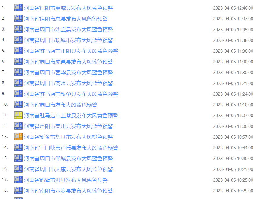 河南省气象台10时也发布大风蓝色预警:预计今天白天,全省大部西北风4到5级,济源、焦作、三门峡、洛阳、郑州、许昌西部、平顶山、漯河、安阳西部、新乡西部、开封西部、南阳西部和北部、驻马店北部阵风8到9级,其中三门峡北部、洛阳北部、新乡西部局部10级以上。