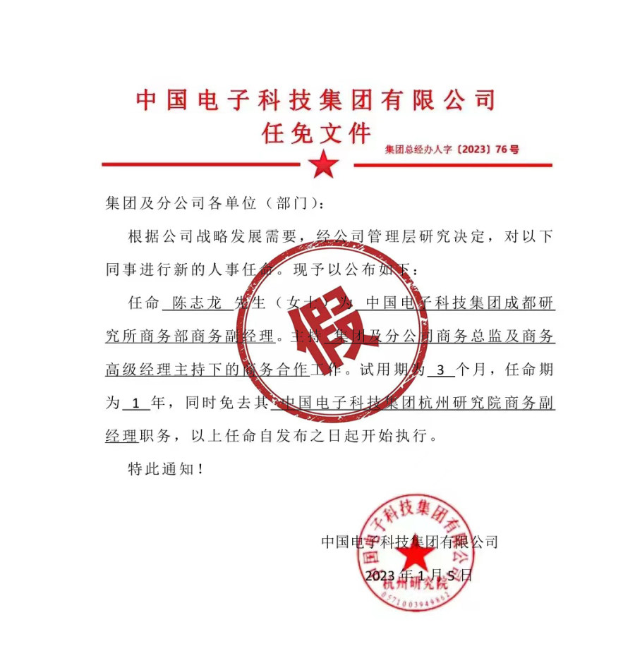 这份成文于2023年1月5日的文件称,“任命陈志龙先生(女士)为中国电子科技集团成都研究所商务部商务副经理。主持集团及分公司商务总监及商务高级经理主持下的商务合作工作。试用期为3个月,任命期为1年,同时免去其中国电子科技集团杭州研究院商务副经理职务,以上任命自发布之日起开始执行。”