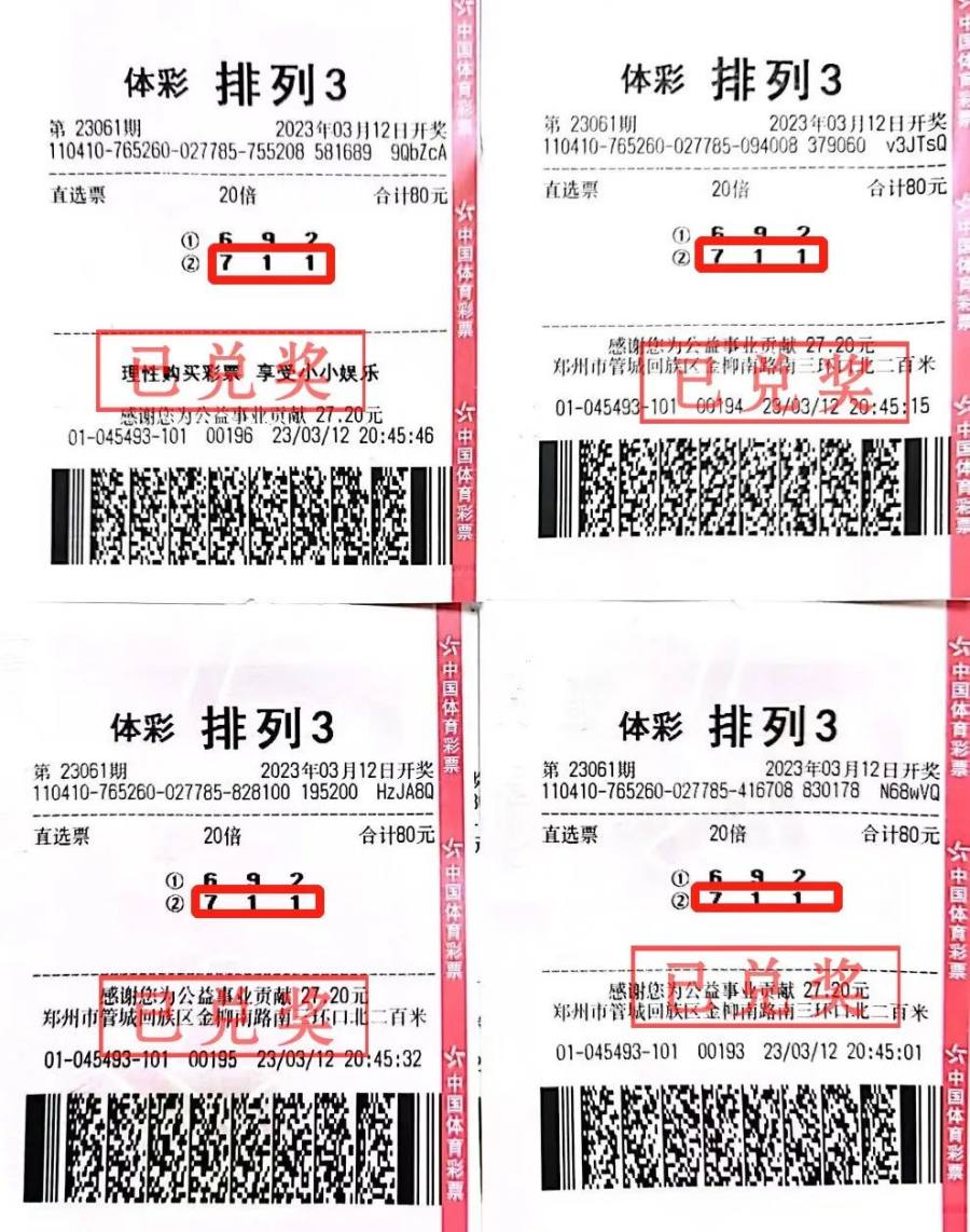 3月12日,位于郑州市管城回族区金柳南路南三环口北的4101045493实体店购彩者王先生(化姓)以4张体彩排列3直选票喜中23061期80注直选一等奖。