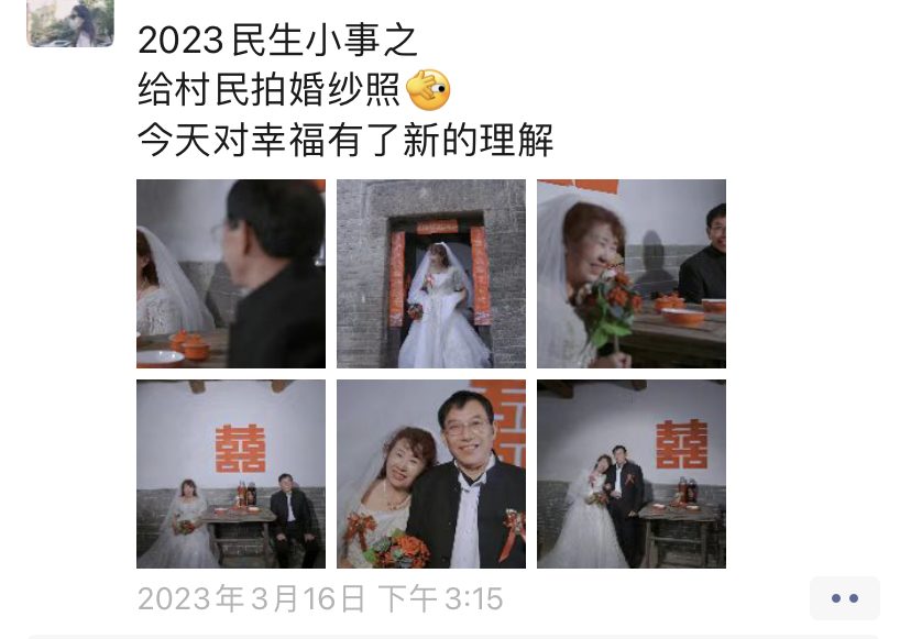 在张桂芳看来,村民们的笑容是她最大的幸福。3月中旬,张桂芳在她的朋友圈分享了一组照片,并配文:2023民生小事之给村民拍婚纱照,今天对幸福有了新的理解。