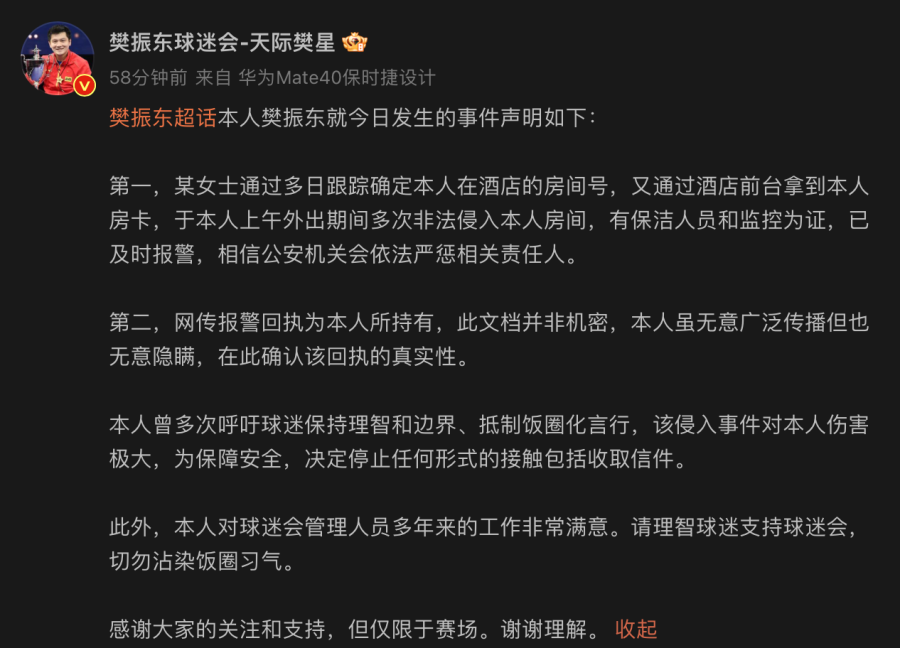 4月6日晚,国乒运动员樊振东通过@樊振东球迷会-天际樊星 发布声明回应房间被非法侵入。第一,某女士通过多日跟踪确定本人在酒店的房间号,又通过酒店前台拿到本人房卡,于本人上午外出期间多次非法侵入本人房间,有保洁人员和监控为证,已及时报警,相信公安机关会依法严惩相关责任人。