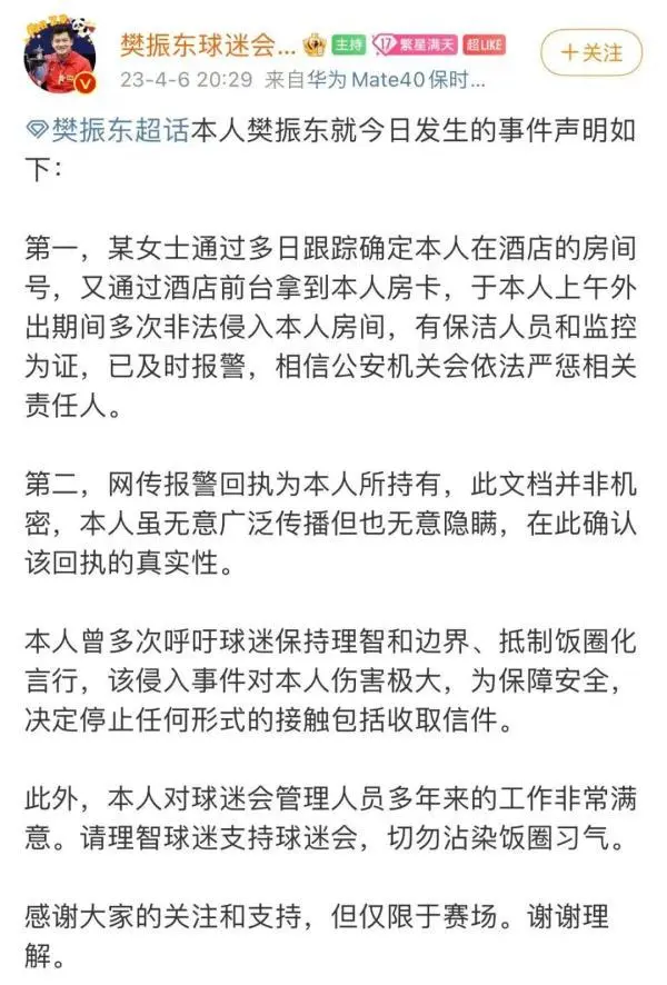 4月6日晚,国乒球员樊振东发布声明,称某女士通过多日跟踪确定其在酒店的房间号,又通过酒店前台拿到房卡,于他上午外出期间多次非法侵入其房间,有保洁人员和监控为证,已及时报警。樊振东呼吁,请理智的球迷支持球迷会,切勿沾染饭圈习气。