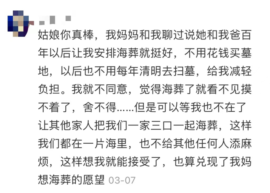 也有网友认为,将亲人海葬以后就看不见摸不着了,会有些舍不得,但可以在自己去世后和父母一同海葬。