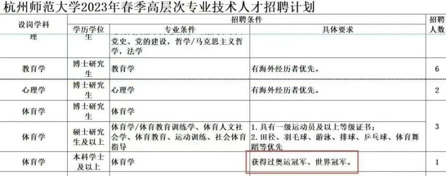 近日,有条招聘教师的帖子在网上火了。一名用户发帖表示:“这个学校招聘教师居然要求奥运冠军。所以说全国冠军也不能报,太卷了太卷了!”网友发布的图片显示,这是杭州师范大学上个月发布的招聘启事,其中一个体育教师岗位的具体要求是“获得过奥运冠军、世界冠军”。对此有网友表示,“不拿奥运冠军,谁本科能进杭师大当老师啊”。
