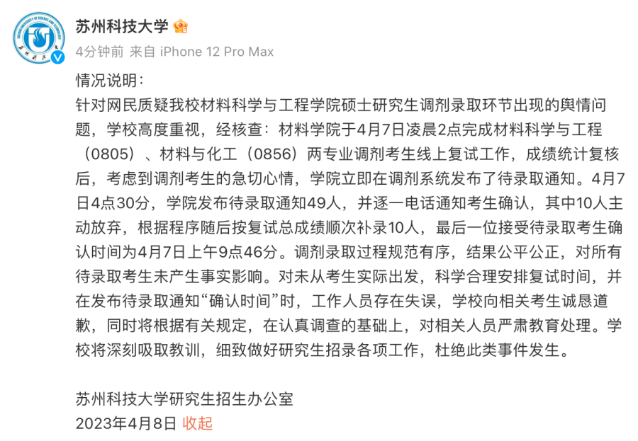4月8日,就凌晨4点发考研待录取通知并要求半小时内确认事件,苏州科技大学研招办发布情况说明,全文如下: