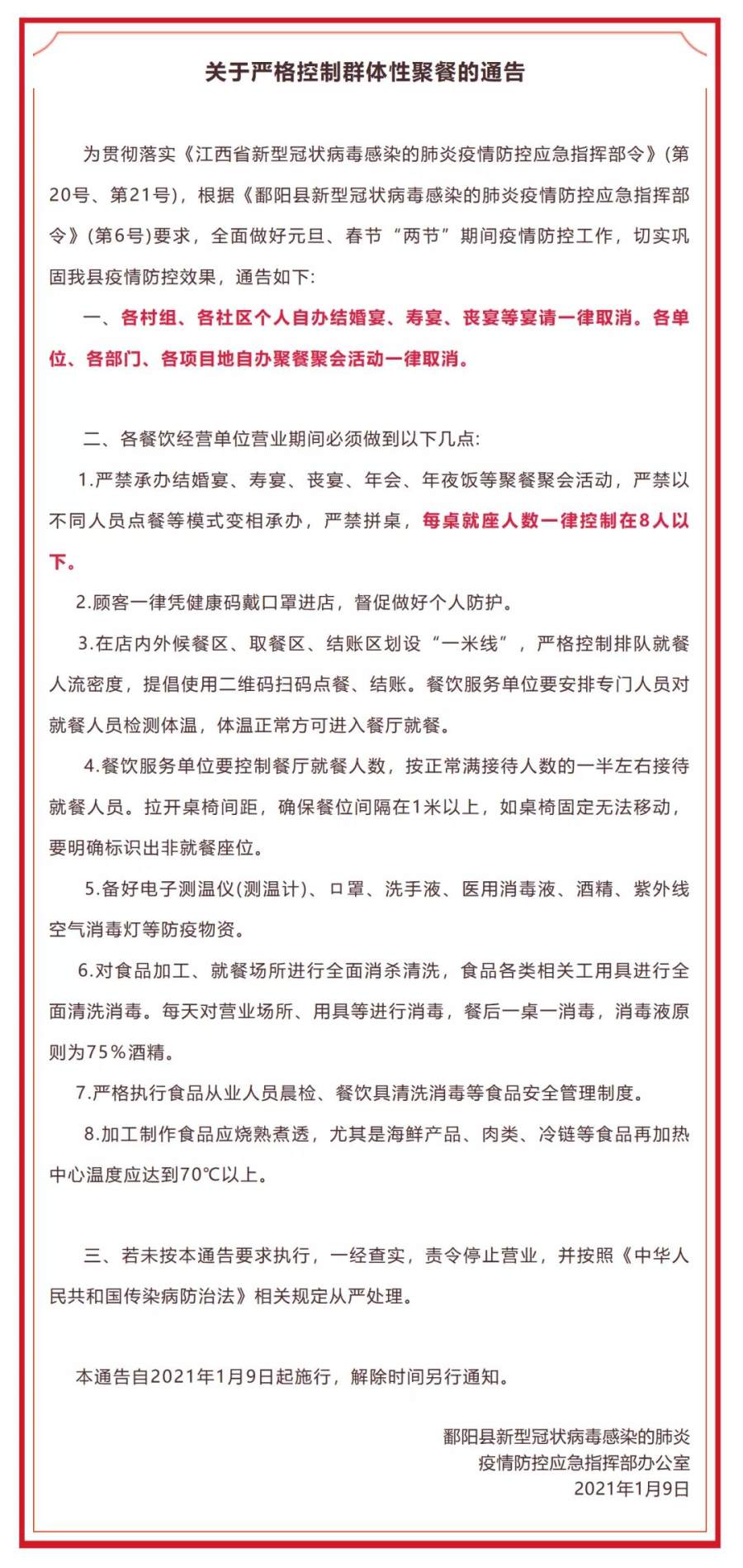 江西鄱阳发布关于严格控制群体性聚餐的通告