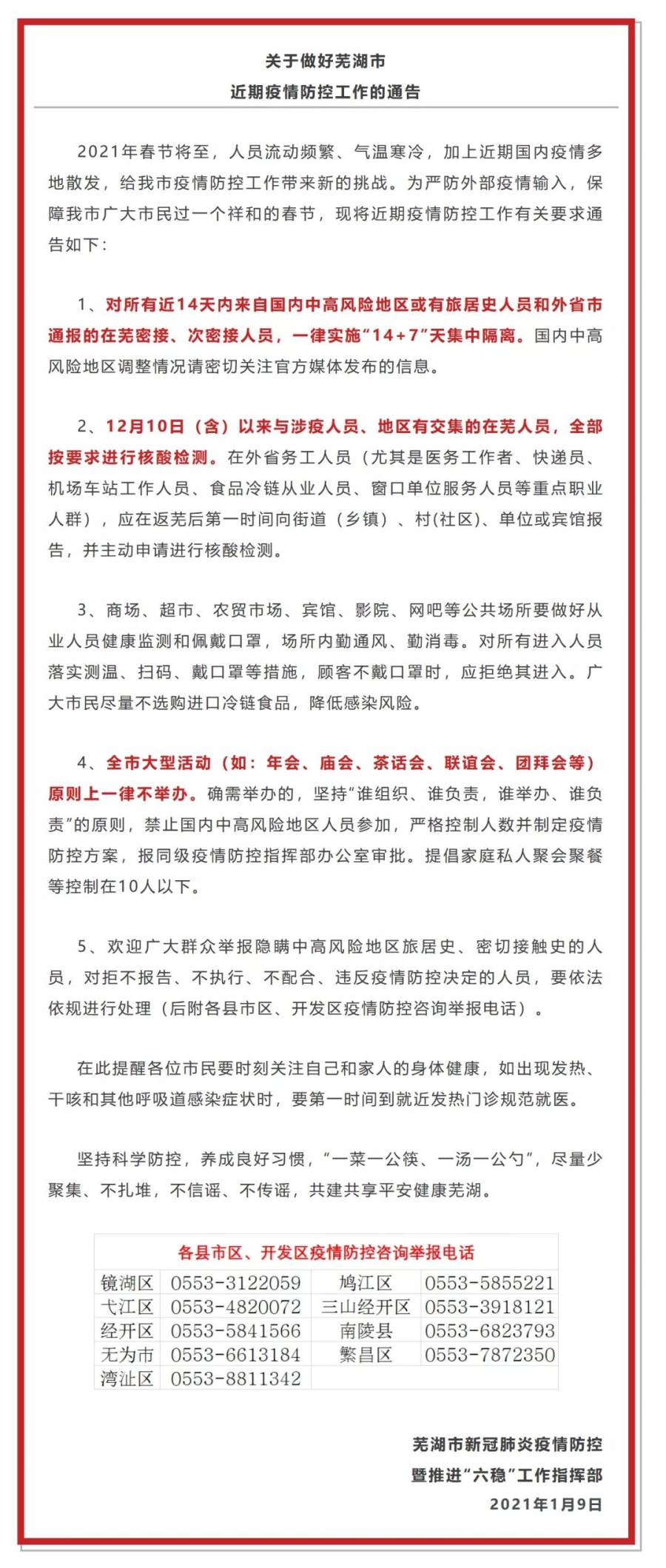 安徽芜湖发布通告要求: