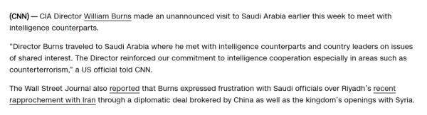 据美国有线电视新闻网报道,伯恩斯与沙特高级官员讨论了“共同利益”,包括情报合作和反恐等问题。《华尔街日报》文章称,伯恩斯对沙特接受中国斡旋与伊朗复交、沙特与叙利亚走近等表示“失望”“错愕”,重申伊朗和叙利亚仍处于美国的制裁中。
