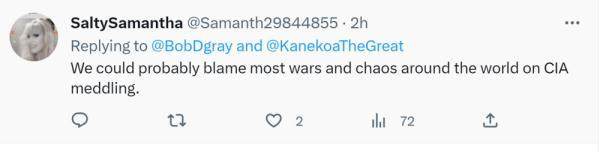 网友“有趣的萨曼莎”说:“世界上绝大多数的战争和混乱都是美国中央情报局带来的吧。”