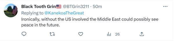 一名自我介绍是美国退役军人的网友“现身说法”:“真讽刺,没有美国掺和,中东或许未来就会实现和平。”