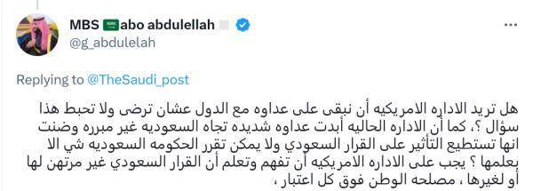 沙特网友阿博·阿卜杜勒拉言辞激烈地批评:“只有我们与其他国家保持敌意美国才不会失望吗?美国政府对沙特表现出强烈而无理的敌意,居然还认为它可以影响沙特的决定、沙特只能在它的指导下做事?美国政府必须了解,沙特的决定不依附于任何其他人。祖国的利益高于一切。”