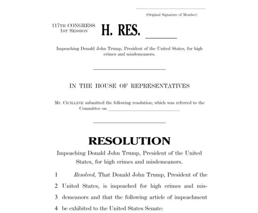 2019年12月,众议院曾表决通过两项针对特朗普的弹劾条款,指控他“滥用职权”和“妨碍国会”,但最终被参议院否决。仅仅11个月后,在其总统任期仅剩不到两周时,特朗普再一次面临被弹劾。
