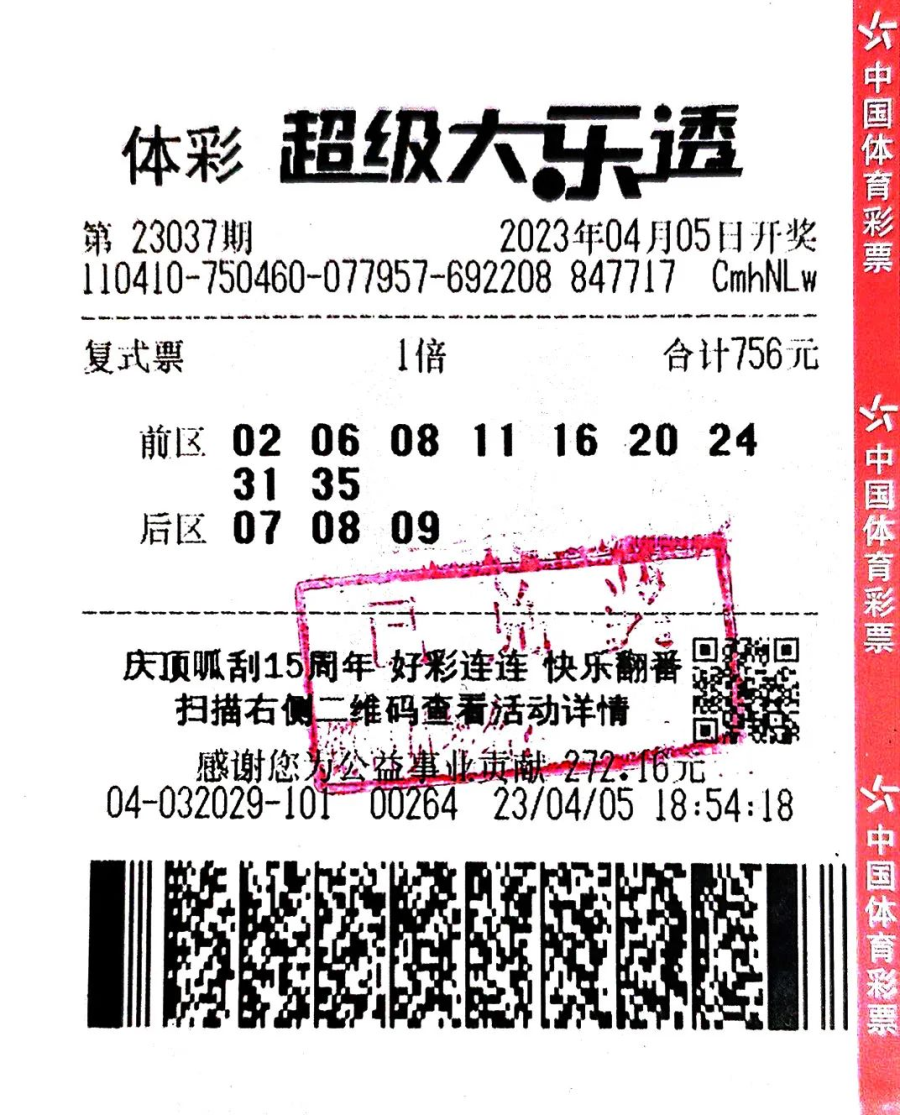超级大乐透第23037期,河南省平顶山市中出一等奖1注,中奖票为一张9+3复式投注彩票,单票总奖金808万元!这张中奖彩票是由12位购彩者共同购买!