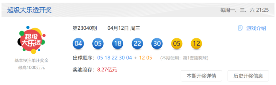 奖池方面,当期开奖结束后,8.27亿元滚存至4月15日(周六)开奖的第23041期。按照超级大乐透10亿元大派奖规则,当期1500万元一等奖派奖金额全部派完,下期一等奖将继续派送1500万元;当期500万元二等奖派奖金额全部派送完毕,下期将继续派送500万元。