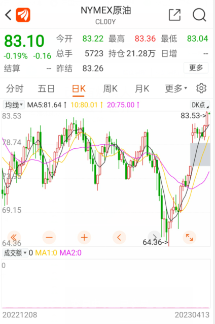 自上一轮也就是3月31日24时国内汽柴油价格下调后,4月3日,国际油价突然跳涨,当天纽约原油期货价格大涨6.32%并站上80美元/桶上方,布伦特原油期货价格涨幅也达到6.12%。之后的几个交易日,纽约原油期货价格大部分时间在80美元上方。
