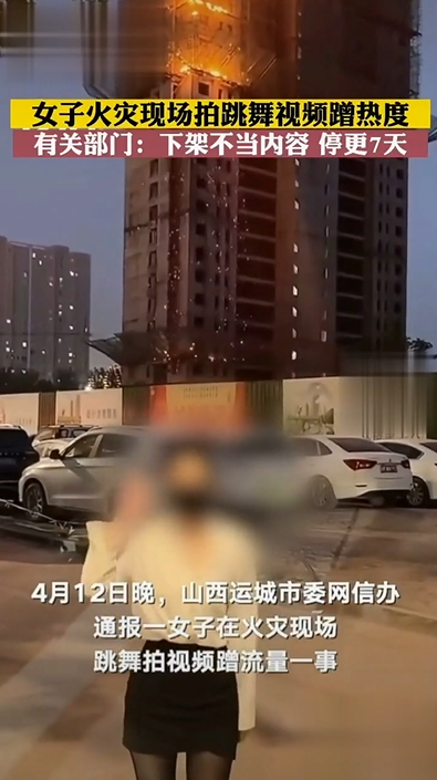 近日,山西运城一在建项目工地发生火情,在现场消防人员全力紧张灭火之际,一女子发布了以火情现场为背景的舞蹈视频,引发网络热议。4月12日晚,运城市委网信办发布通报称,该账号涉嫌消费灾情、搭蹭流量,已责令下架不当内容,并停更7日。