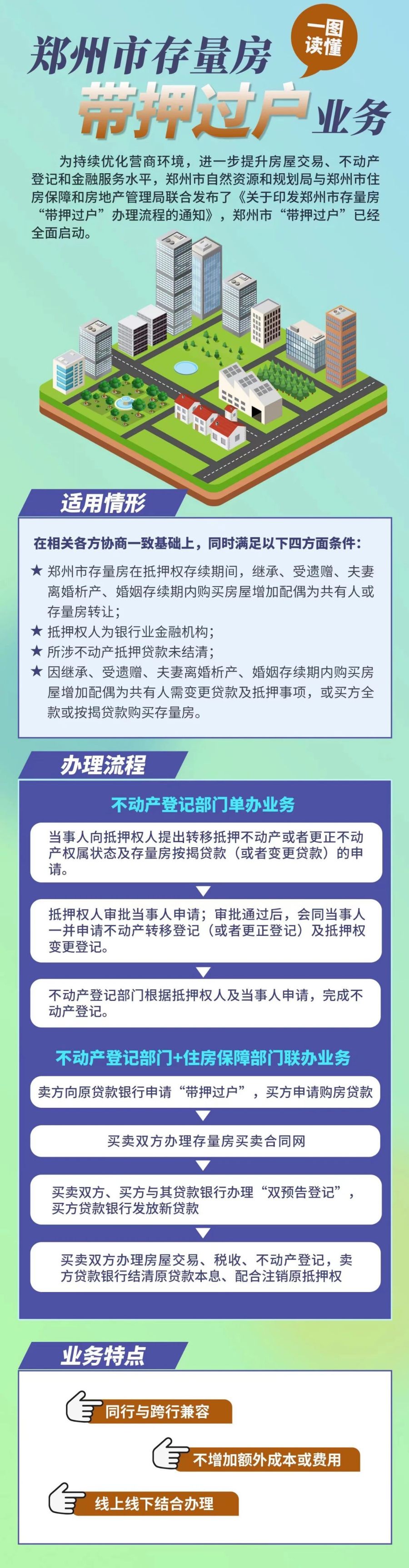据郑州市不动产登记中心4月14日消息,2022年10月份以来,郑州市自然资源和规划局联合市住房保障局、市金融工作局、国家税务总局郑州市税务局等多部门积极推进存量房“带押过户”工作,结合实际案例边研究边办理、边开展边优化。2023年4月,市自然资源和规划局会同市住房保障和房地产管理局共同印发《郑州市存量房“带押过户”办理流程》,该项工作进入全面推广阶段。