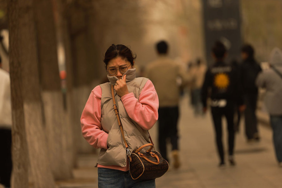 2023年4月11日,辽宁沈阳,市民在沙尘天气中出行