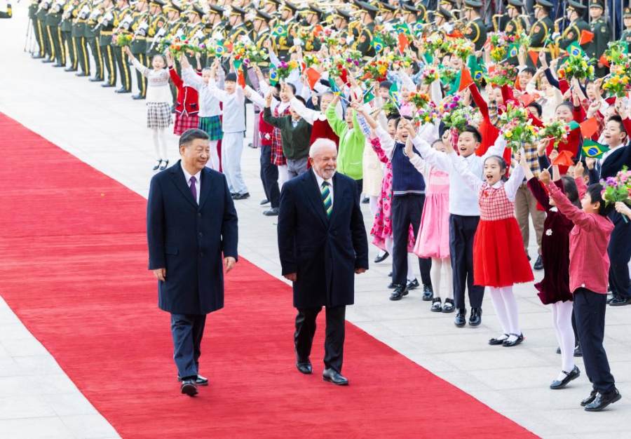 4月14日下午,国家主席习近平在北京人民大会堂同来华进行国事访问的巴西总统卢拉举行会谈。这是会谈前,习近平在人民大会堂东门外广场为卢拉举行欢迎仪式。新华社记者 黄敬文 摄