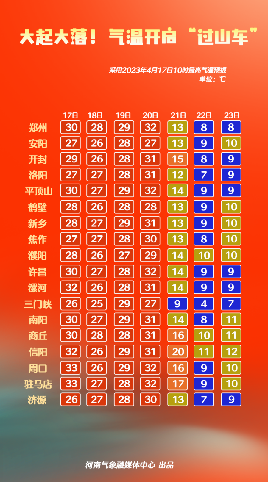 17日下午到夜里,安阳、新乡西部、济源、焦作、三门峡、洛阳、郑州西部、许昌西部、平顶山、南阳、漯河、周口、驻马店、信阳有分散性阵雨、雷阵雨,其中三门峡、洛阳、南阳、信阳部分县市有中到大雨,局地并伴有雷暴大风、短时强降水、冰雹等强对流天气。