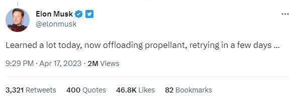 SpaceX公司首席执行官马斯克随后在推特上发文称,“今天学到了很多,现在卸载推进剂,过几天再尝试……”