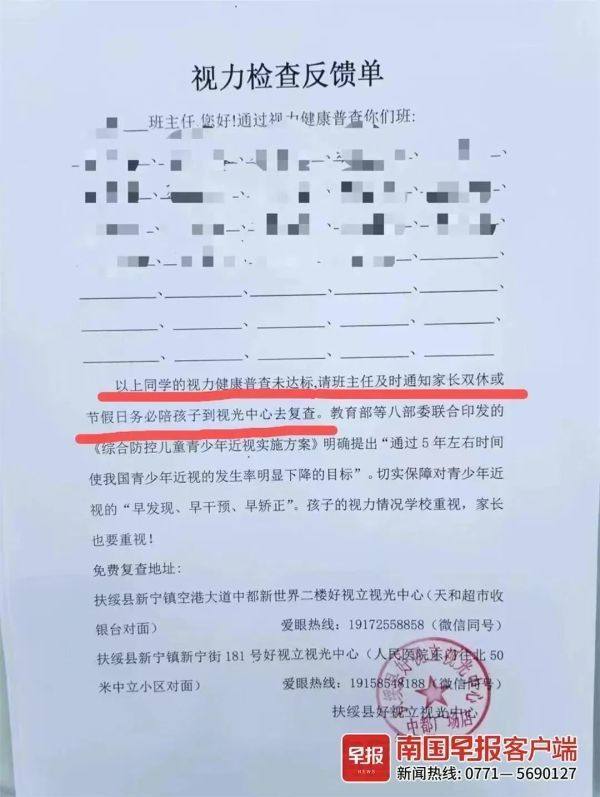 3月份,广西扶绥县一些中小学让当地眼镜店为学生检查视力,并通过班主任通知家长,带“视力健康普查未达标”的孩子去复查,被不少家长质疑。4月17日,扶绥县教育局相关部门负责人称,经过教育局同意进校检查的机构并不包括“好视立”等眼镜店,后续将加强监督管理,要求学校努力改进工作,不再让眼镜店这样的社会机构为学生检测。(4月18日南国早报客户端)