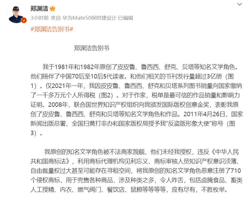 郑渊洁发“告别书”:维权难,不再发表新作