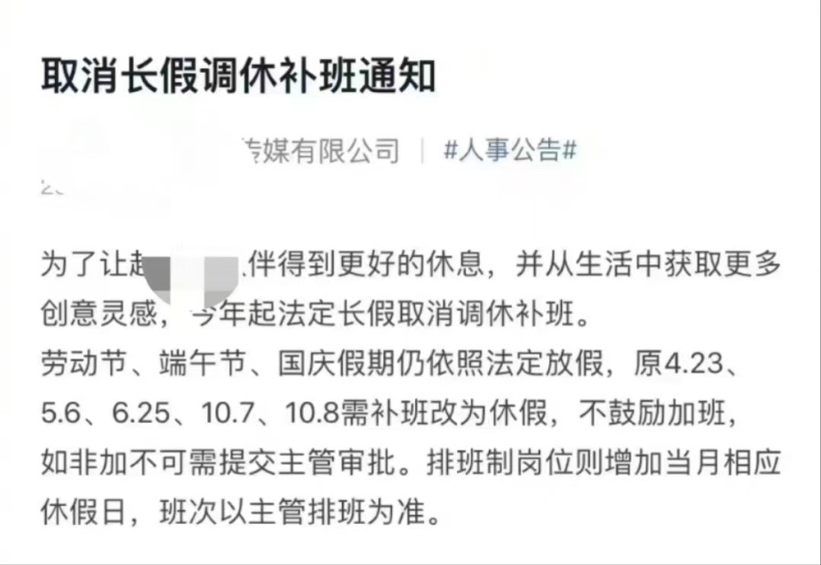 当许多网友还在为五一调休感到郁闷时,一家公司却发布了“取消调休补班通知”,引发了网友关注。4月18日,厦门一公司发布通知称,今年起法定长假取消调休补班,补班改为休假,不鼓励加班。