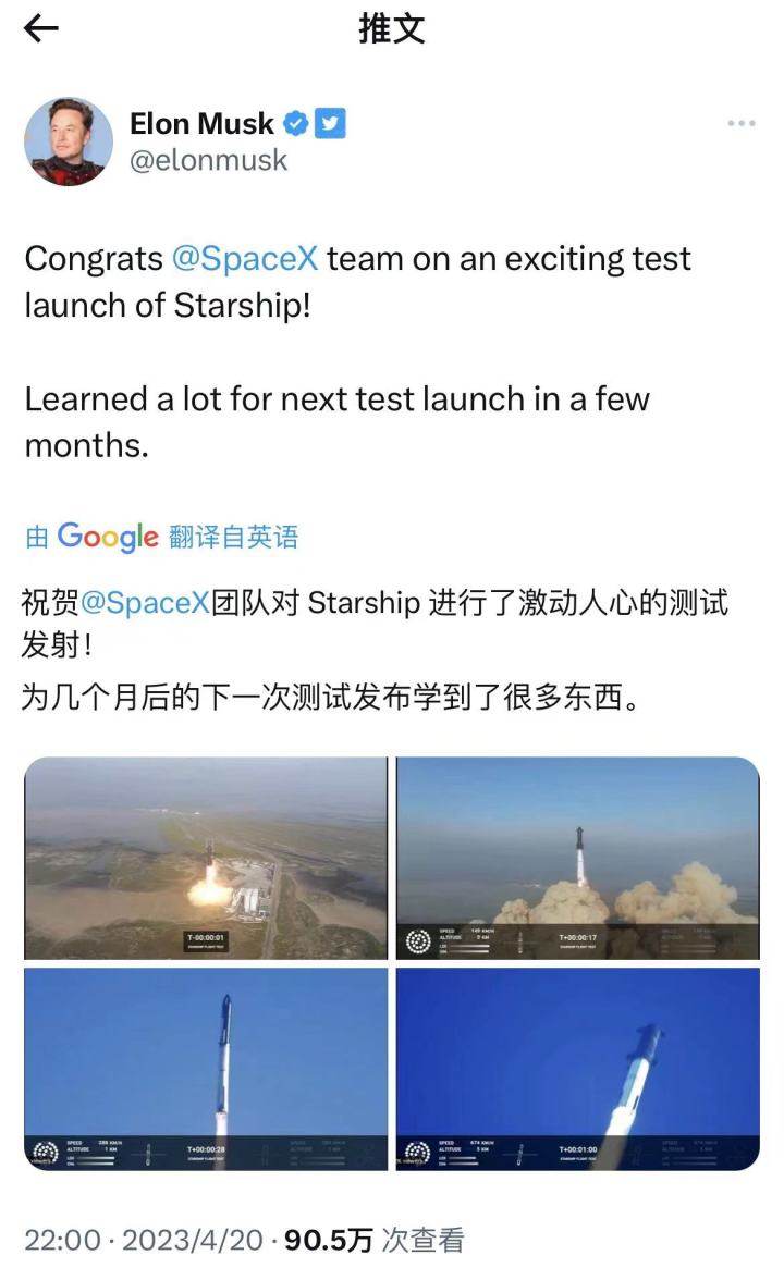 这次“计划外的失败”,被许多网友冠以“虽败犹荣”的评价。马斯克却似乎对此结果早有心理准备,他第一时间发推文回应:祝贺SpaceX团队对星舰进行了激动人心的测试发射!为几个月后的下一次测试发射学到了很多东西。这番话,体现了他一贯的直面失败的作派。