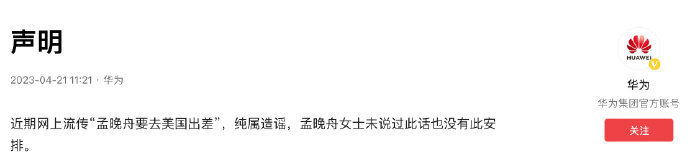 华为集团4月21日发布声明称:近期网上流传“孟晚舟要去美国出差”,纯属造谣,孟晚舟未说过此话也没有此安排。