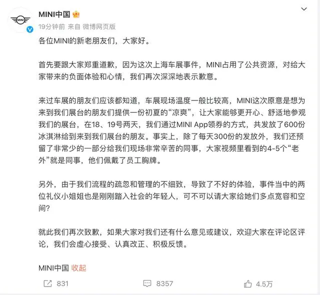 4月21日,宝马MINI中国再次就冰淇淋被指区别对待中国人一事道歉。MINI中国官方称,车展现场预留了非常少的一部分冰淇淋给辛苦工作的同事,视频里看到的4-5个“老外”就是同事,他们佩戴了员工胸牌;并呼吁,事件当中的两位礼仪小姐姐也是刚刚踏入社会的年轻人,可不可以请大家给她们多点宽容和空间?
