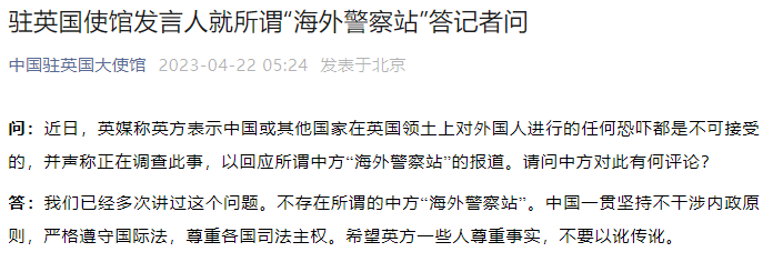 驻英国使馆发言人就所谓“海外警察站”答记者问