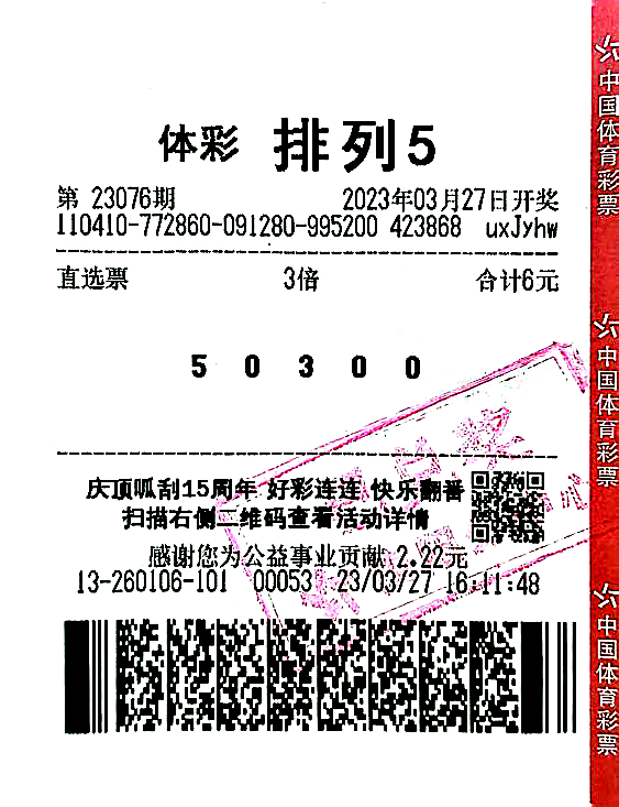 3月27日,体彩排列5第23076期开奖,开奖号码为:5 0 3 0 0。南阳市淅川县购彩者赵先生(化姓)揽获3注一等奖,中得奖金30万元。