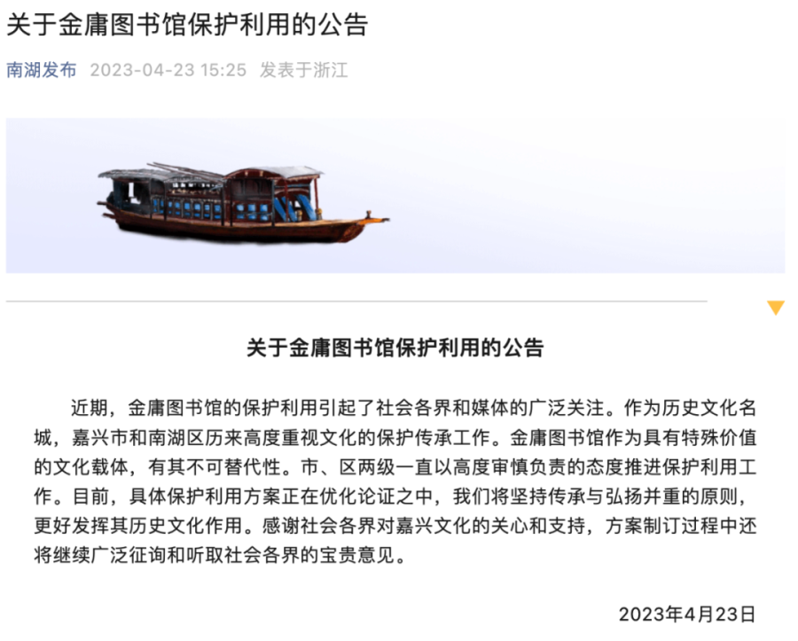 必须指出的是,金庸图书馆的保留,并不是因为此番舆论场的热议。早在2021年12月,嘉兴市人民政府官网公布了一份《对市政协八届五次会议第226号提案的答复》。该份答复就嘉兴市文化广电旅游局与嘉兴市文物局就金庸图书馆今后的去留与定位提出了3条意见,分别是切实做好金庸图书馆建筑保护、进一步挖掘金庸文化资源与精准把握金庸图书馆功能定位。