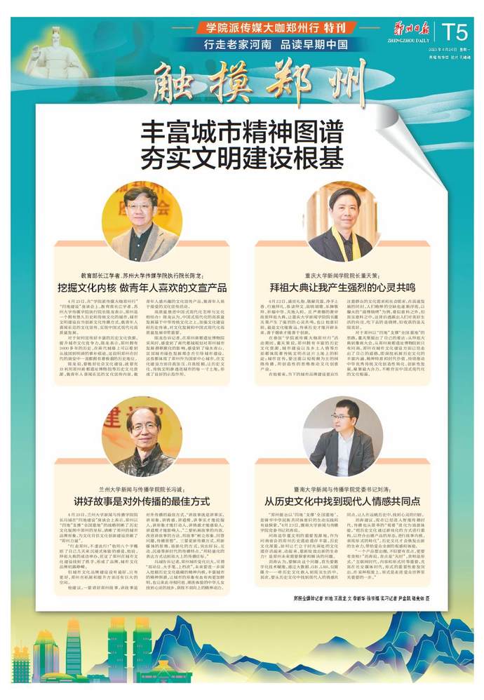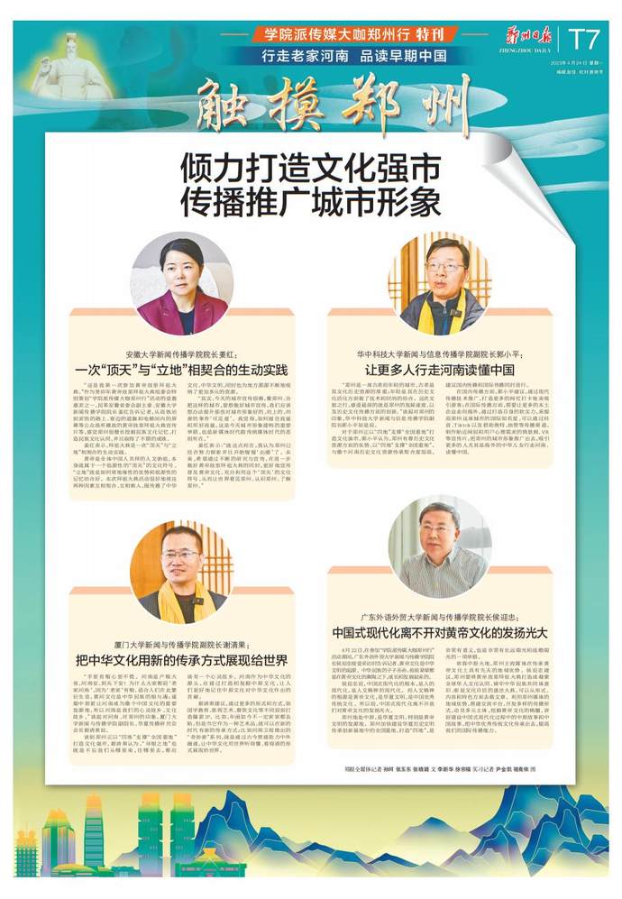 陈刚说,在全媒体融媒体时代,郑州要善于利用数字技术、智能媒体等传播新技术和新媒体,进一步提升中华优秀文化传播的效果。同时,发挥坐拥众多遗迹资源的地域优势,结合科技成果,营造沉浸式文化体验场景,让不同地域、不同角色的人参与进来,充分挖掘、放大郑州历史文化优势,擦亮郑州历史文化品牌。