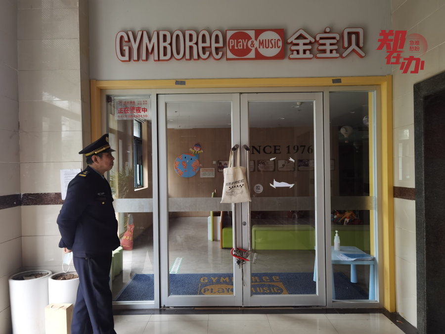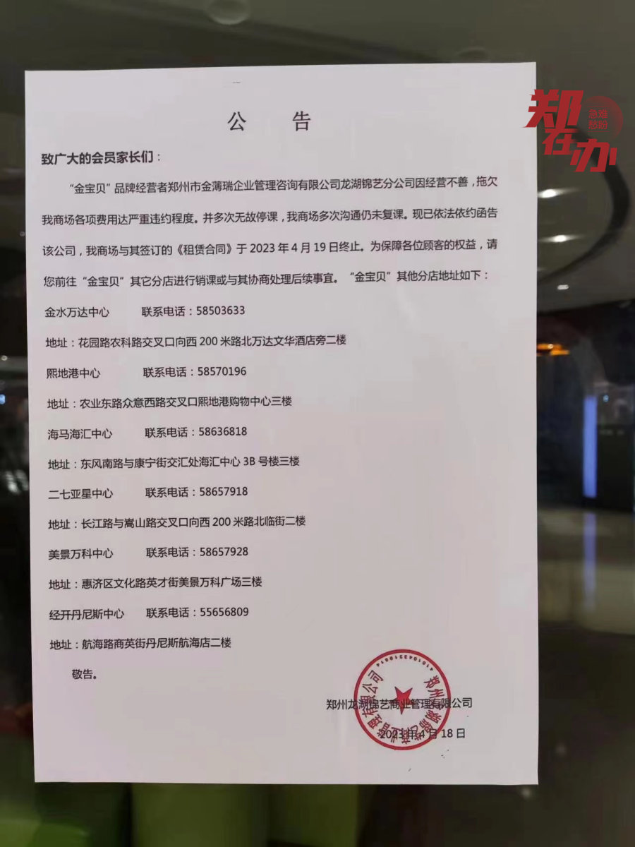 二七亚星中心店门口出现了保安轮值场景,中原锦艺城购物中心则于4月4日贴出公示,称郑州市博纬教育信息咨询有限公司(金宝贝品牌经营者)拖欠商场各项费用达“严重违约”程度,商场催缴无果后已依法函告该公司,且与金宝贝租赁合同于4月30日到期,告知顾客前往其他分店销课或与其协商后续处理事宜。