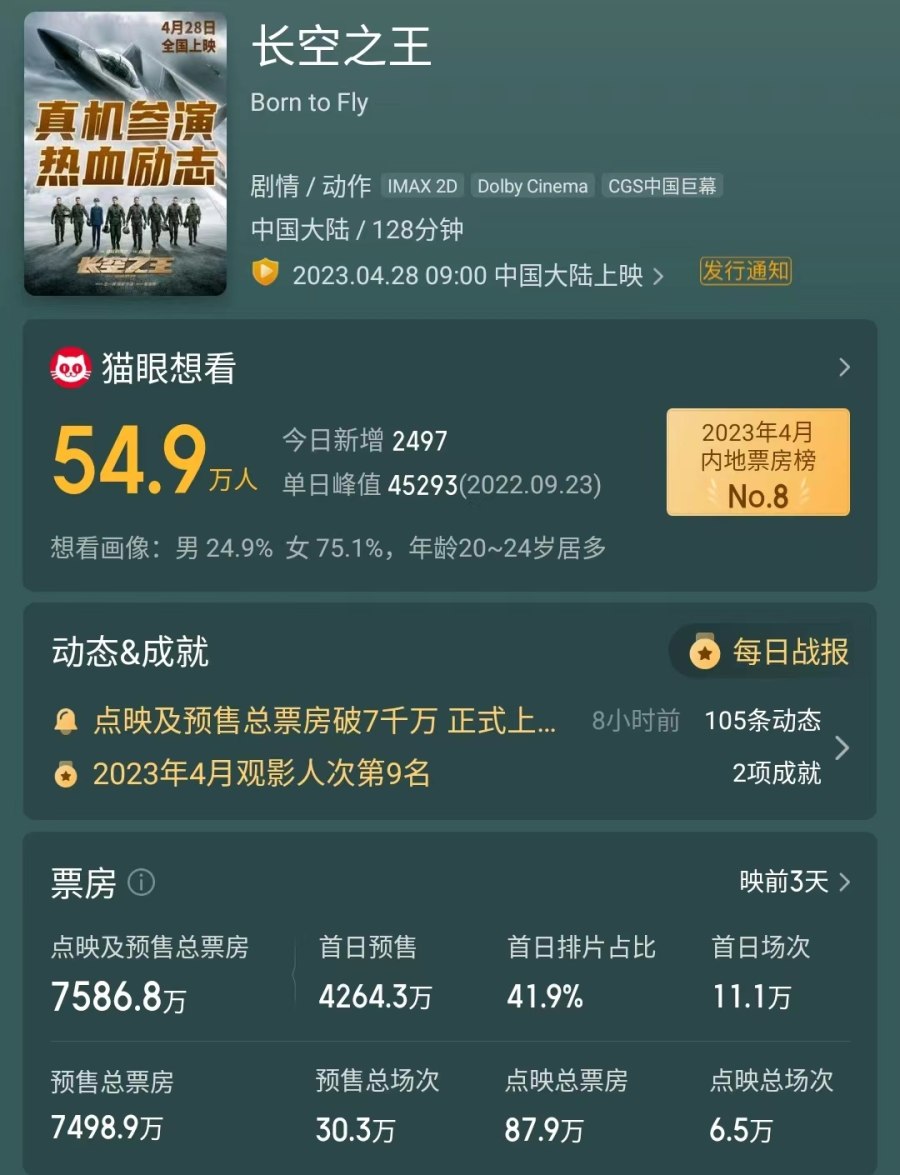 其中,由王一博、周冬雨、胡军主演的《长空之王》以绝对优势领跑五一档期热度。该片定档4月28日上映,是国内首部聚焦空军试飞员群体的影片,从阵容到题材都是引人注目的标准大制作。截至4月25日18时,《长空之王》点映及预售总票房破7500万元,远超其他影片。