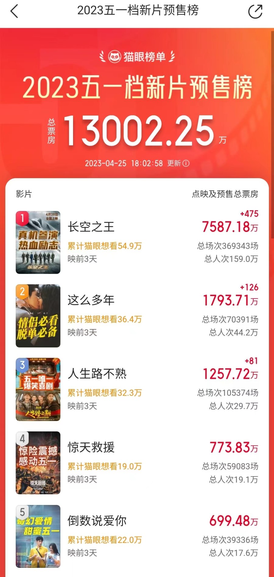 2023年电影五一档即将于4月28日拉开帷幕。据猫眼专业版最新消息,截至4月25日18时,已经有16部影片定档五一,新片预售总票房破1.3亿元。