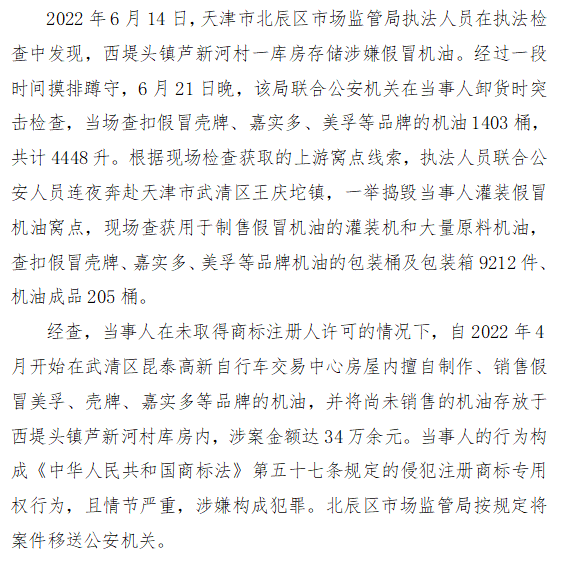 一、天津市北辰区市场监管局查处李某某制售假冒“壳牌”等品牌机油案