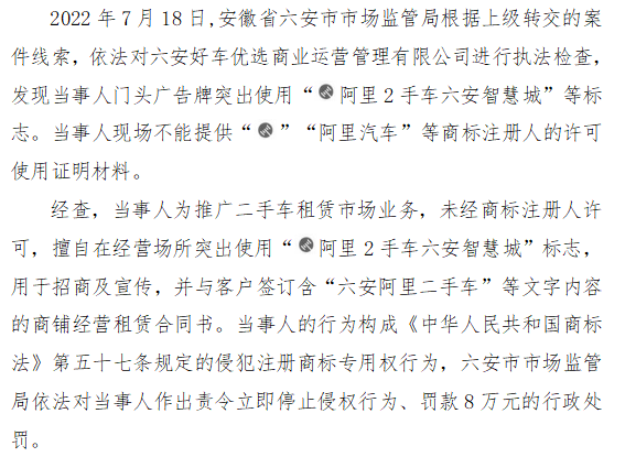 三、安徽省六安市市场监管局查处六安好车优选商业运营管理有限公司侵犯“阿里汽车”注册商标专用权案