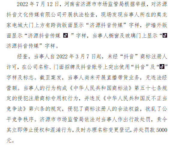 四、河南省济源市市场监管局查处济源市抖音文化传媒有限公司侵犯“抖音”注册商标专用权案